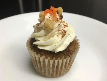 With fresh organic grated carrots, organic cream cheese frosting and walnuts