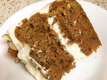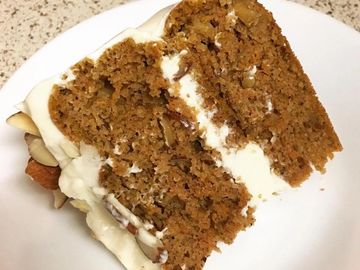 With fresh grated carrots, cream cheese frosting and walnuts